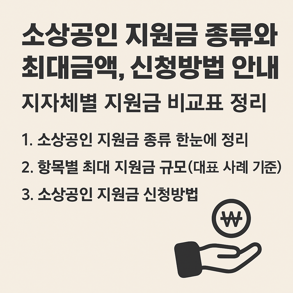 이 글에서는 대표적인 소상공인 지원금 종류를 항목별로 정리하고, 서울·경기·부산 등 주요 지자체의 지원금 주요 차이를 비교표로 정리했습니다.