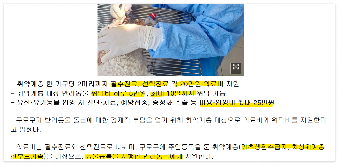 | 필수진료 | - 기초 건강검진 - 필수 예방접종(예: 광견병 등 관내 기준에 따름) - 심장사상충 예방약(예방 목적) - 마리당 지원한도: 20만원 이내(보호자 부담금 1만원 발생) |