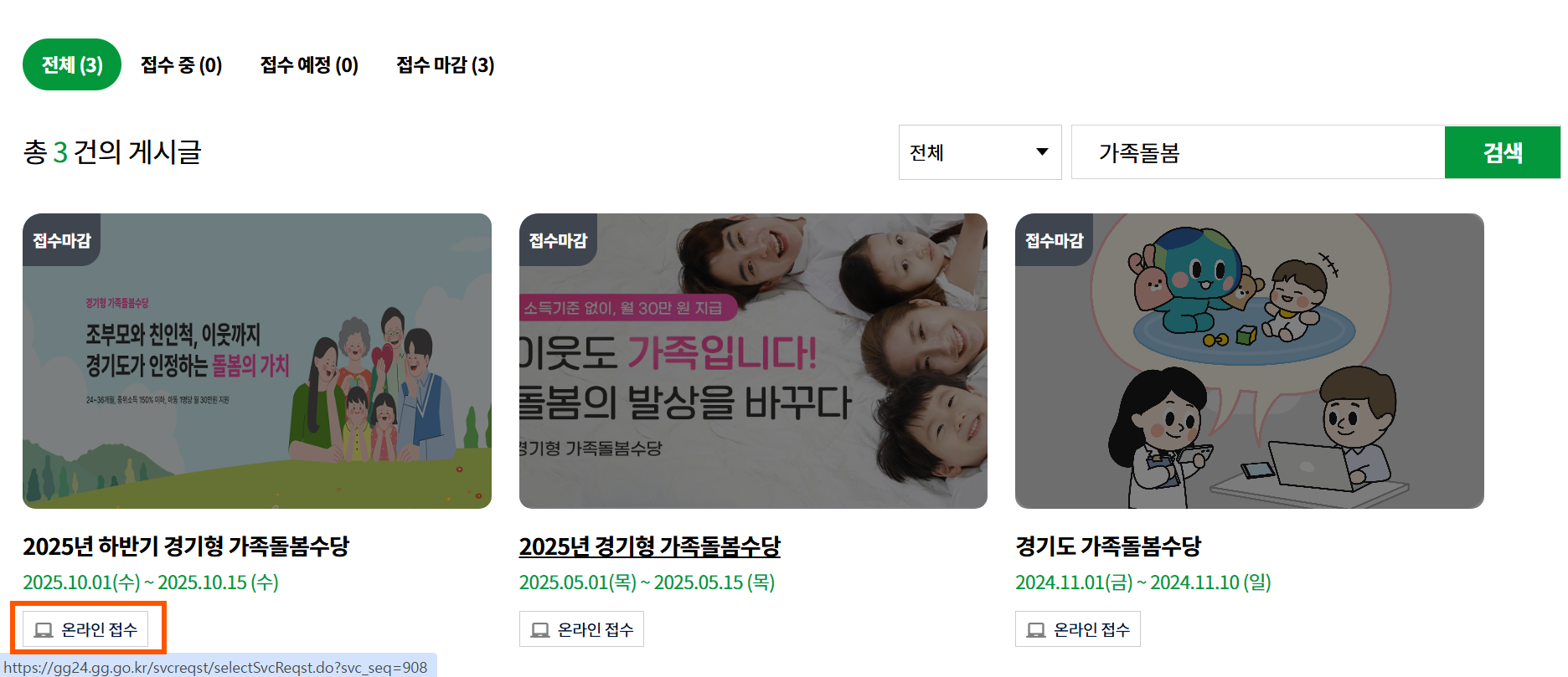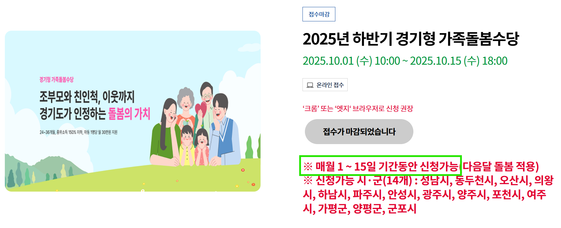 경기형 가족돌봄수당은 정부 아이돌봄 서비스에 선정되지 않은 가정만 신청할 수 있습니다. 만약 여성가족부에서 운영하는 아이돌봄 서비스를 이용 중이라면, 이 제도를 함께 이용할 수 없습니다.