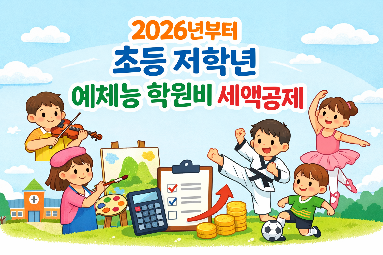 2026년 새해를 맞아 자녀 양육 가정의 부담을 덜어주는 제도가 한층 확대됐습니다. 그중에서도 학부모들의 관심이 큰 변화는 초등학교 저학년 자녀의 예체능 학원비도 세액공제 대상에 포함된다는 점입니다. 기존에는 취학 전 아동만 가능했던 공제가 학교에 입학한 이후에도 이어지면서, 음악·미술·체육 활동을 꾸준히 이어가는 가정에 실질적인 도움이 될 것으로 보입니다.
