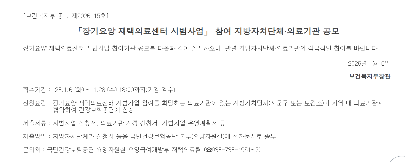 2026년 장기요양 재택의료센터 시범사업 참여 지방자치단체·의료기관 공모(1차) < 공고 < 공지사