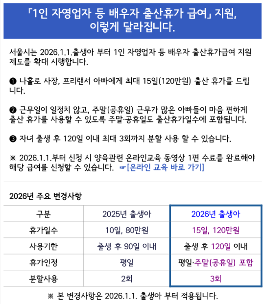 혼자 일하는 개인사업자와 프리랜서에게 출산은 기쁨과 동시에 현실적인 부담으로 다가오는 경우가 많습니다. 가게 문을 닫거나 업무를 쉬는 순간 바로 소득 활동이 중단되기 때문입니다. 이러한 현실을 고려해 서울시는 1인 자영업자와 프리랜서를 위한 출산 관련 지원 제도를 단계적으로 확대해 왔으며, 2026년부터는 배우자 출산휴가급여가 한층 강화됩니다.