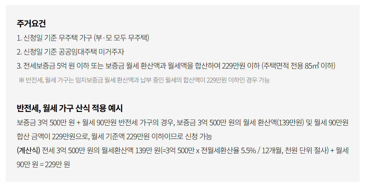 주택 면적은 전용 85㎡ 이하로 동일하며, 반전세와 월세 가구도 보증금 환산액과 실제 월 납부액을 합산해 기준을 충족하면 신청할 수 있습니다.