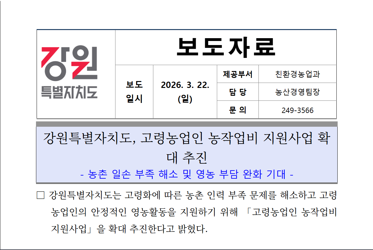 출처: 연합뉴스 (2026.03.22) — 강원도, 고령 농업인 농작업비 지원 사업 추진